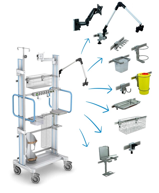 Power strip, monitor mount, accessory basket, instrument rail, cable arm, IV line, articulating arm, keyboard tray, waste bag holder, oxygen bottle holder, foldable side plate for a mouse...
